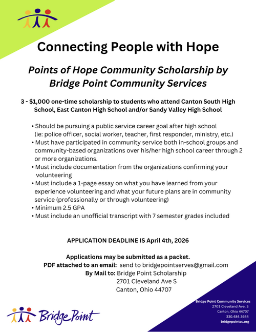 Bridge Point's scholarship program was established in 2016 and since then, we have contributed $14,500 to local seniors to further their career goals in the area of public service. Applications are accepted from January - March each year and can be mailed/dropped off at Bridge Point or emailed to bridgepointserves@gmail.com.