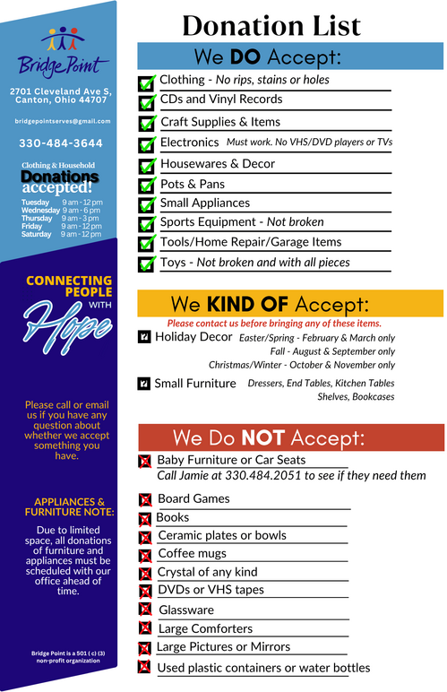 We also accept donations of items for our HOPEfully Yours Thrift Store. All items in our thrift store have been donated to Bridge Point and we just ask for a fair donation amount for any items selected from our store. All donations go towards purchasing resources for individuals and families in need within the communities we serve.